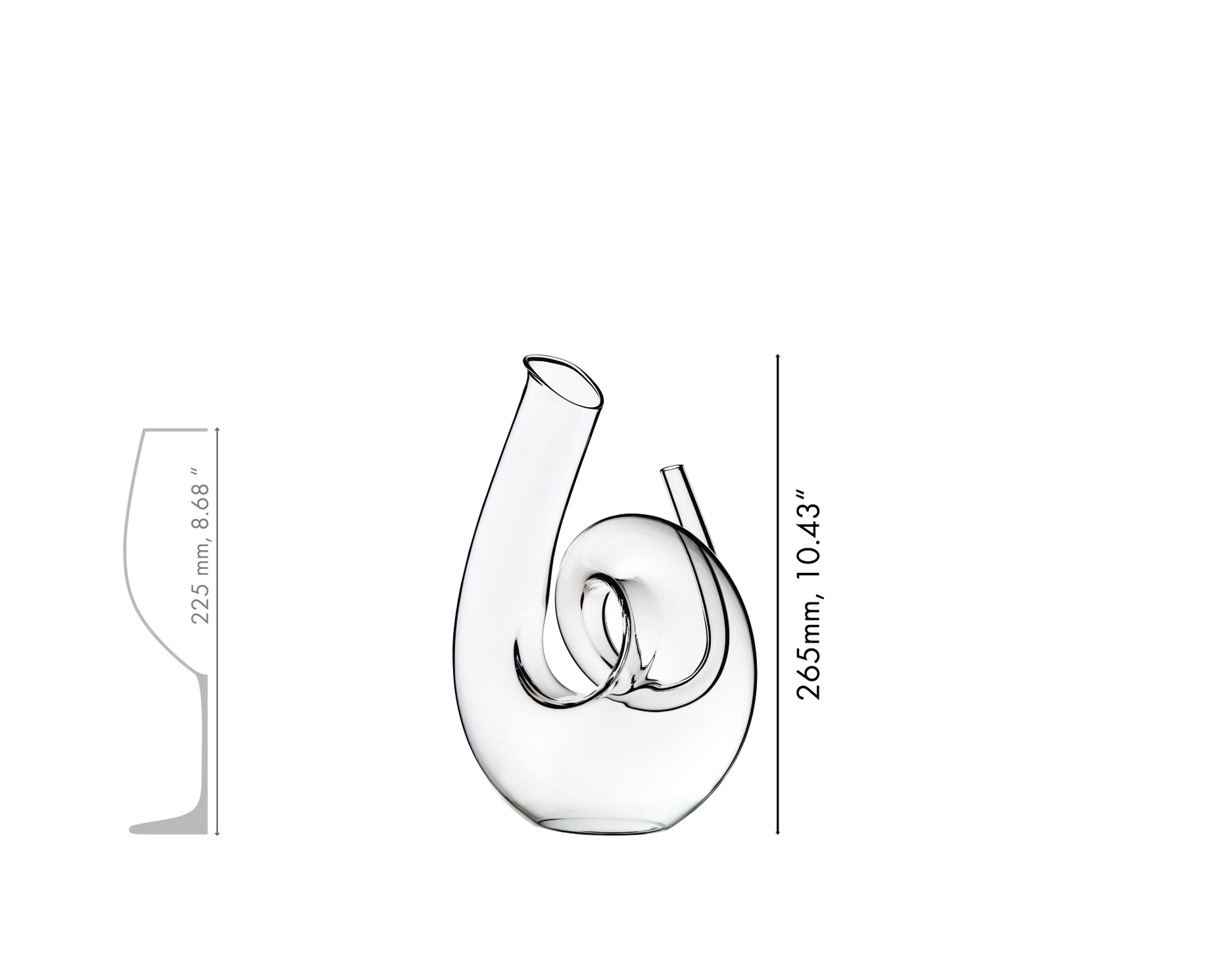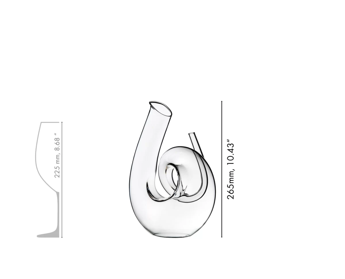 Gli avvolgimenti e la curvatura del decanter Curly consentono di caricare e aerare il vino. Le torsioni del decanter formano una spirale morbida e giocosa, con una coda sottile decorativa e un beccuccio più largo per versare il vino con facilità. Questo decanter è realizzato a mano, il che significa che ogni pezzo è leggermente diverso dall’altro.